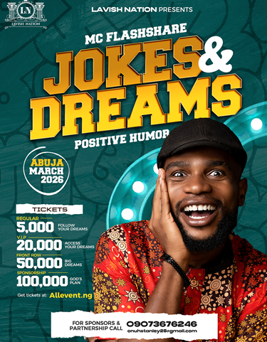 Jokes and Dreams is an annual comedy experience hosted by Mc Flashshare Holding in Abuja, where talent meets creativity and laughter takes center stage. The event unites comedians, brands, celebrities, and entertainment lovers for a night of unforgettable fun.