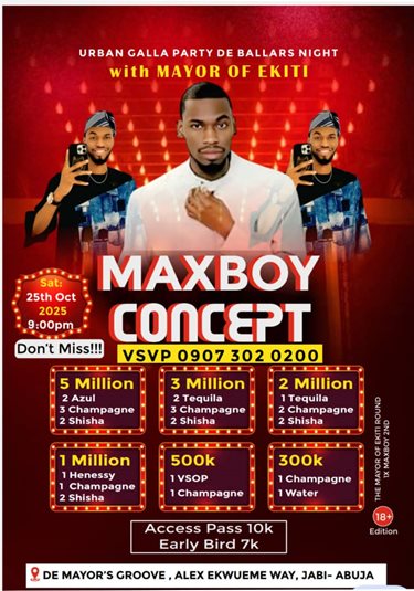 Get Ready for the most Epic Night in abuja, Come and experience the ultimate Urban Galla Party With Live Music Dancing and Unforgettable Moments!!!Best Value for your money don't miss out on this incredible deal !!!👌 Exclusive access to the hottest party in town join the thousands of people who already bought ticket's Don't miss out on Party everyone's talking about! Last chance to buy ticket's Hurry🏃♀️🏃♂️ before they're gone bcus